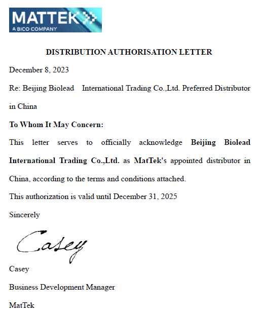 作為MatTek 在中國(guó)區(qū)總代理,北京博蕾德生物科技有限公司為中國(guó)客戶提供全面的MatTek產(chǎn)品和服務(wù)。下圖為MatTek 授權(quán)北京博蕾德生物科技有限公司作為MatTek在中國(guó)區(qū)域的代理授權(quán)書(shū)