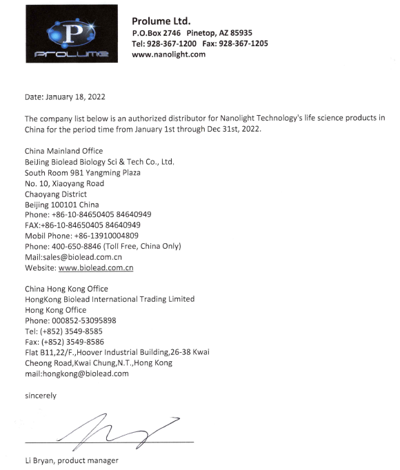 作為NanoLight在中國的區(qū)域總代理,北京博蕾德生物科技有限公司將為中國客戶提供NanoLight優(yōu)質(zhì)的產(chǎn)品與服務。下圖為NanoLight公司授權博蕾德生物作為NanoLight在中國區(qū)域的代理授權書。