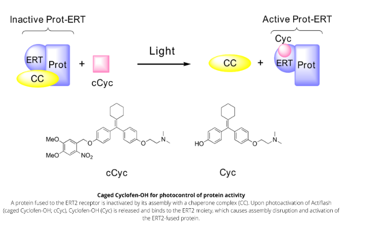 How does it work?Actiflash is a tamoxifen-like caged-inducer called cyclofen. Upon UV-light illumination, optical-induced uncaging of Actiflash quickly releases proteins fused to the modified estrogen receptor ligand-binding domains ERT2. This allows them to translocate into the nucleus, activate transcription (using Gal4-UAS system) or induce recombination (using the Cre-lox one).