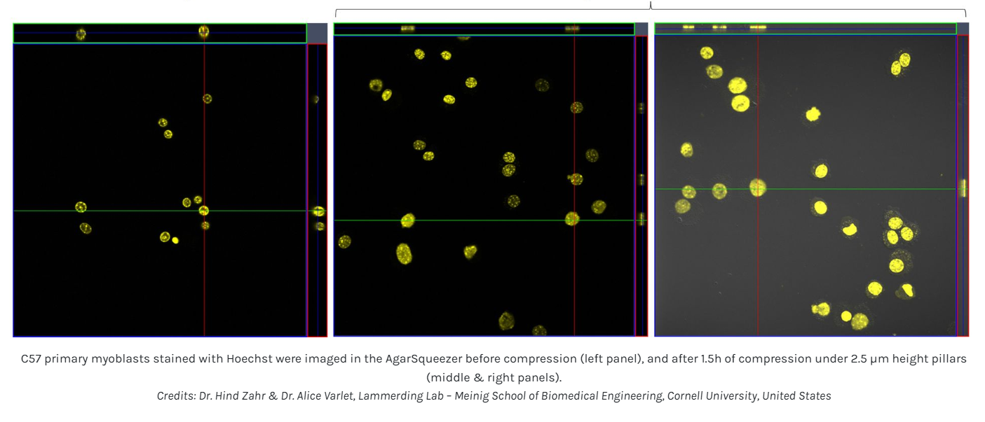 AgarSqueezer is a microscope slide chamber equipped with a molded agar-based compression system. Use it to apply an instant & homogeneous compression on your cells, and study their response to short and long-term confinement.