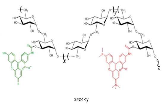 產(chǎn)品結(jié)構(gòu):葡聚糖是由串珠菌B512F菌產(chǎn)生的一類分支多糖。從結(jié)構(gòu)上講,每個熒光團(FITC和TRITC)都通過硫脲乙烷鍵與葡聚糖結(jié)合(圖1)。對于每種熒光團,取代度(DS)在每摩爾葡萄糖單元0.001至0.020摩爾染料的范圍內(nèi)。與葡聚糖結(jié)合的FITC/TRITC的摩爾比可以在1:1至2:1之間變化,并在中性pH下進行分光光度評估。產(chǎn)品純化過程(與相應(yīng)的FITC和TRITC葡聚糖非常相似),終產(chǎn)物不含F(xiàn)ITC、 TRIC游離染料(即未結(jié)合的染料或染料副產(chǎn)物)。純化后對產(chǎn)品的分子量、外觀、溶解度、熒光進行檢測,實際分子量通過GPC法測定。