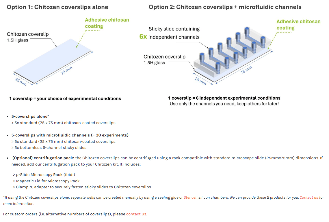 Chitozen coverslips are compatible with 6-channel sticky slides to work in a closed system in static or dynamic flow conditions. Order you coverslips alone if you need to work in an open system (i.e. for AFM imaging) or to place them on depression slides.