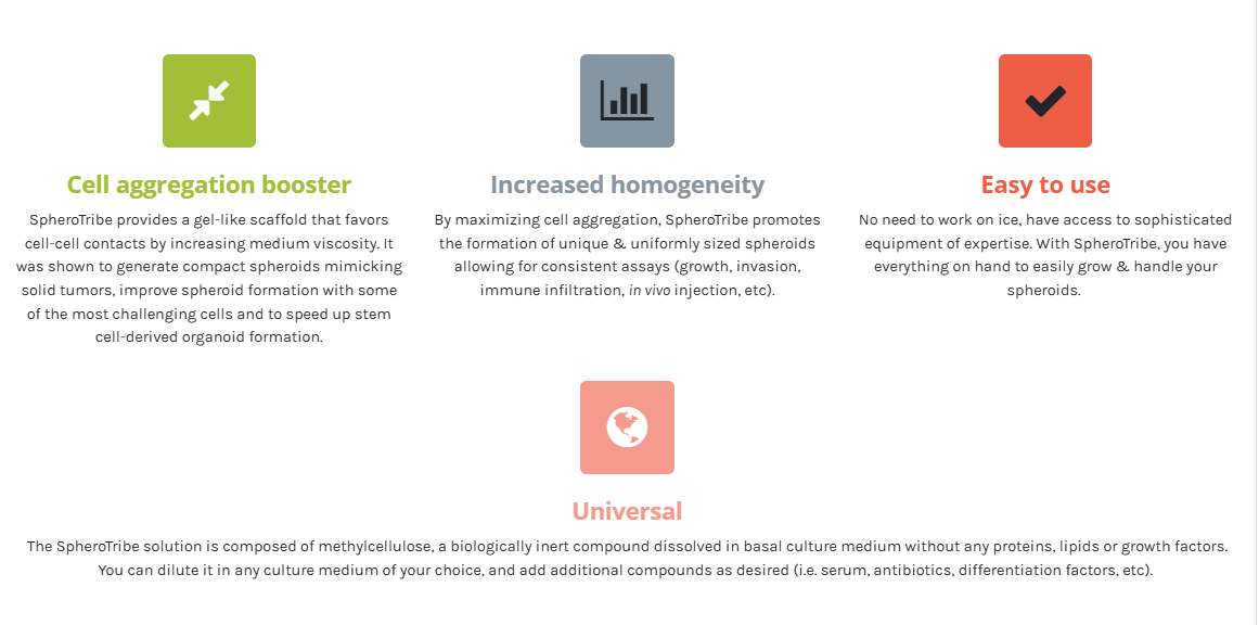 SpheroTribe provides a simple toolkit to generate consistent and robust 3D cell structures (spheroids, organoids) without restriction of cell type. Simply dilute the SpheroTribe solution into your culture medium of choice, watch your cells turn into uniformly sized 3D spheroids and collect them for your downstream assays.