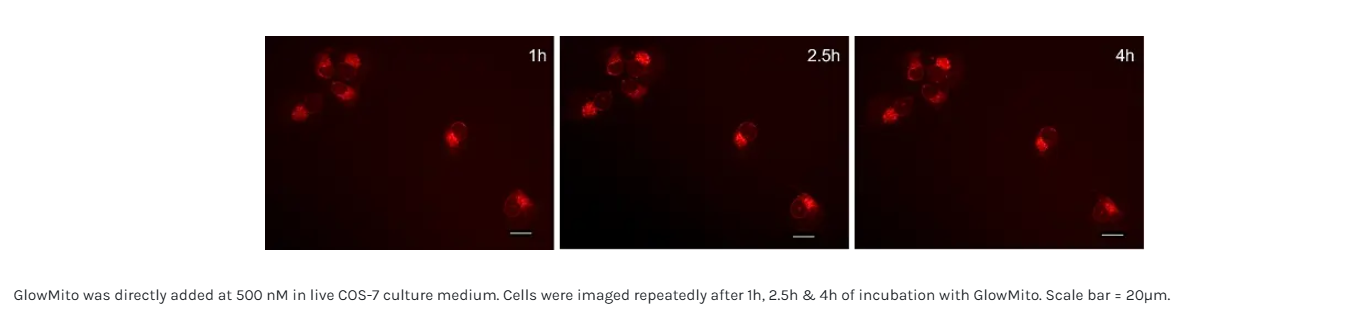 GlowMito quickly penetrates cells and produces a bright & stable red labeling of mitochondria without inducing cell toxicity or altering mitochondrial functions. Simply add it to your culture medium, and image repeatedly for up to 3 days without washing!