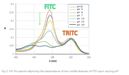 雙重標(biāo)記的特別之處在于,其中FITC熒光(以及吸光度)高度依賴于pH值,而另一個(gè)相應(yīng)的熒光TRIT在pH2 和10之間保持不變(見圖2.)這樣可以準(zhǔn)確測(cè)定活細(xì)胞和組織中的pH值,因此該產(chǎn)品是活體顯微檢測(cè)的有力工具。