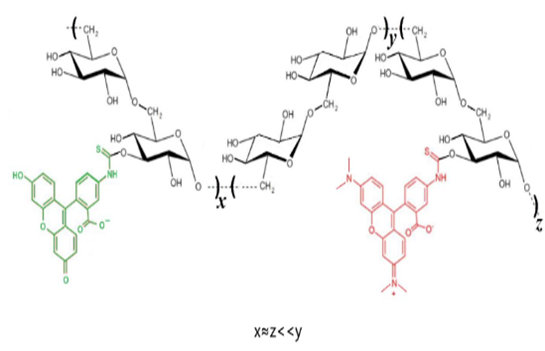 葡聚糖是由串珠菌B512F菌產(chǎn)生的一類分支多糖。從結(jié)構(gòu)上講,每個(gè)熒光團(tuán)(FITC和TRITC)都通過硫脲乙烷鍵與葡聚糖結(jié)合(圖1)。對(duì)于每種熒光團(tuán),取代度(DS)在每摩爾葡萄糖單元0.001至0.020摩爾染料的范圍內(nèi)。與葡聚糖結(jié)合的FITC/TRITC的摩爾比可以在1:1至2:1之間變化,并在中性pH下進(jìn)行分光光度評(píng)估。產(chǎn)品純化過程(與相應(yīng)的FITC和TRITC葡聚糖非常相似),終產(chǎn)物不含F(xiàn)ITC、 TRIC游離染料(即未結(jié)合的染料或染料副產(chǎn)物)。純化后對(duì)產(chǎn)品的分子量、外觀、溶解度、熒光進(jìn)行檢測(cè),實(shí)際分子量通過GPC法測(cè)定。